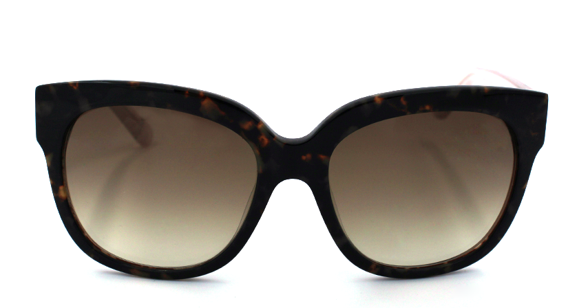 Acetate frame in brown tortoise with transparent pink temples and brown gradient lenses.