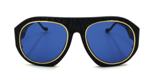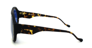 Κοκάλινος σκελετός σε μαύρο με βραχίονες σε καφέ ταρταρούγα και φακούς σε μπλε.