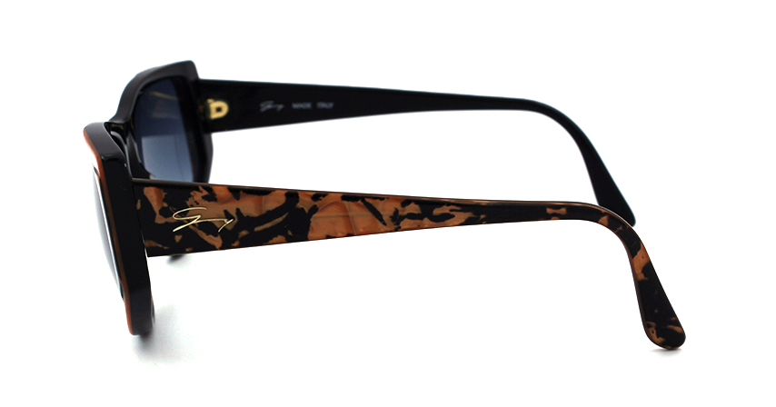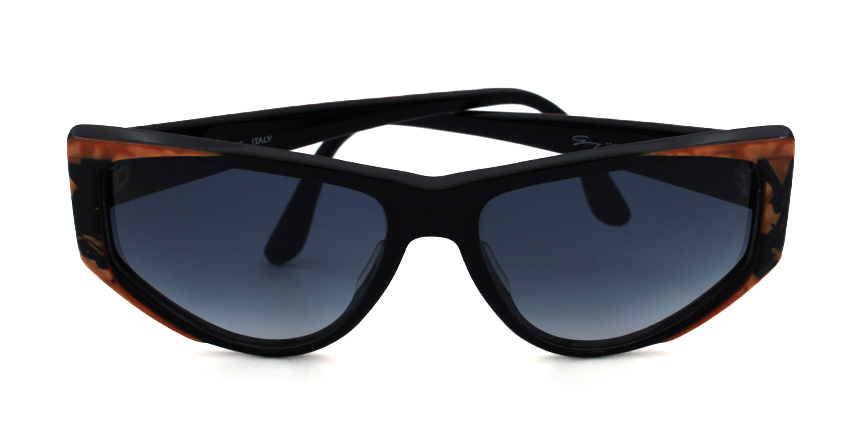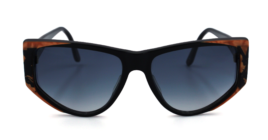 Vintage acetate frame in black with orange and gray gradient lenses.